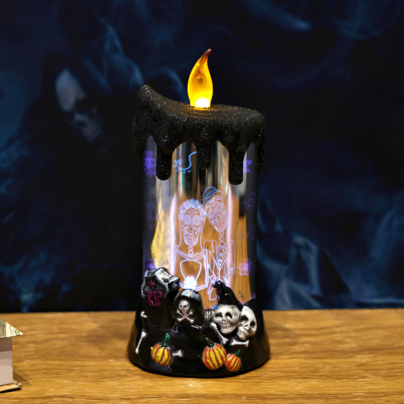 Bu mumlu gece lambası esas olarak siyahtır, alt ve üst kısımda siyah ve altta siyah renkte kafatası şeklinde bir dekorasyon vardırï¼Korkunç bir renk ekleyin