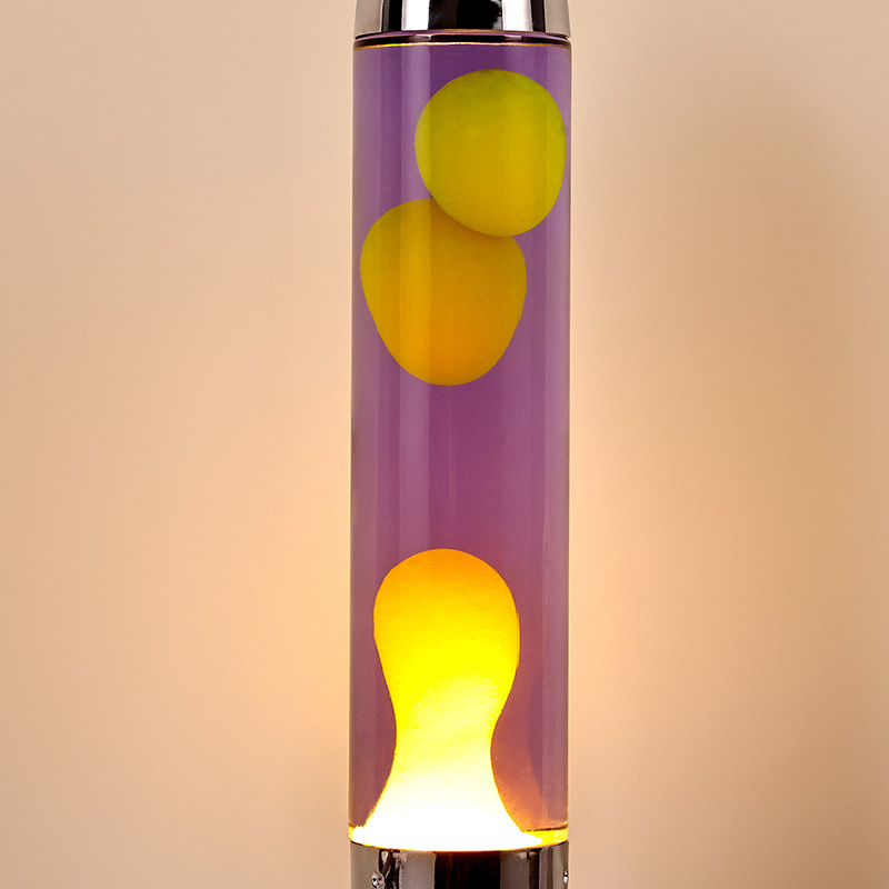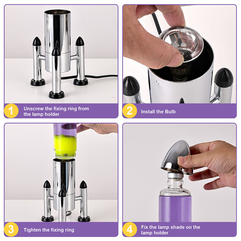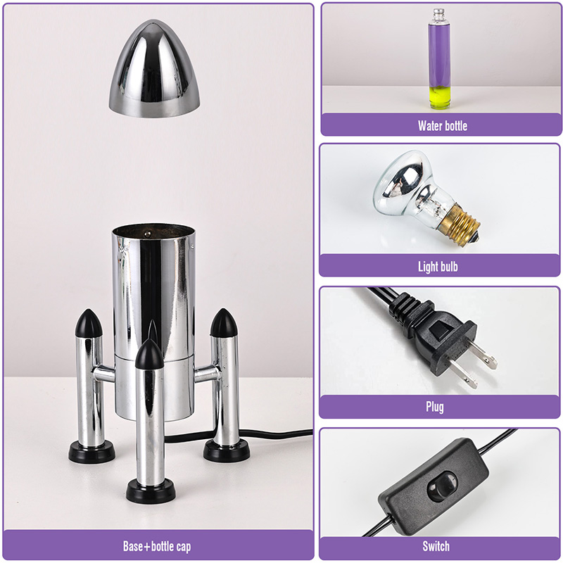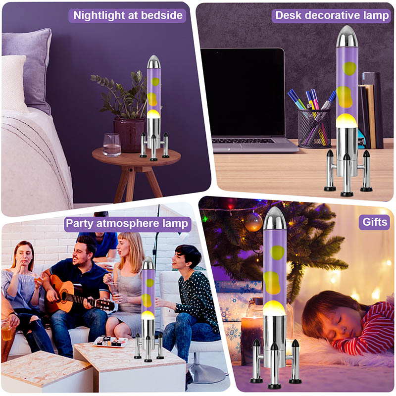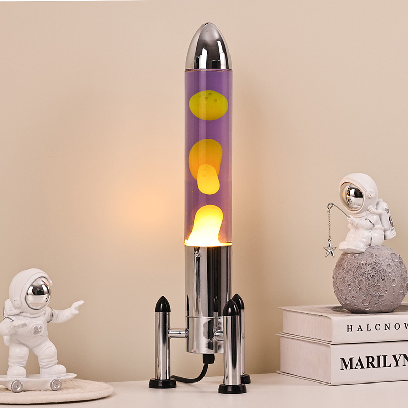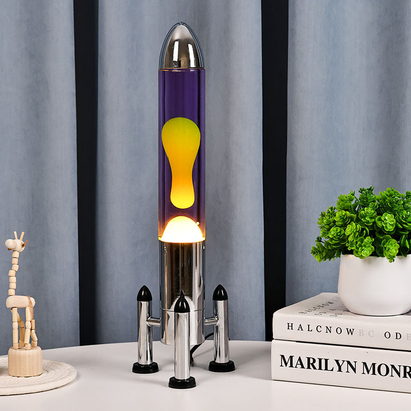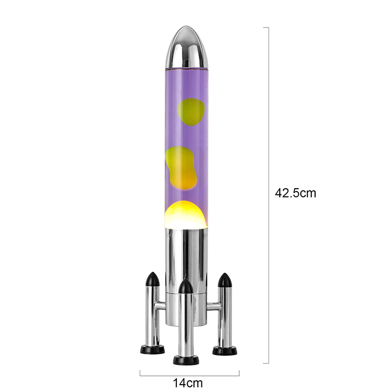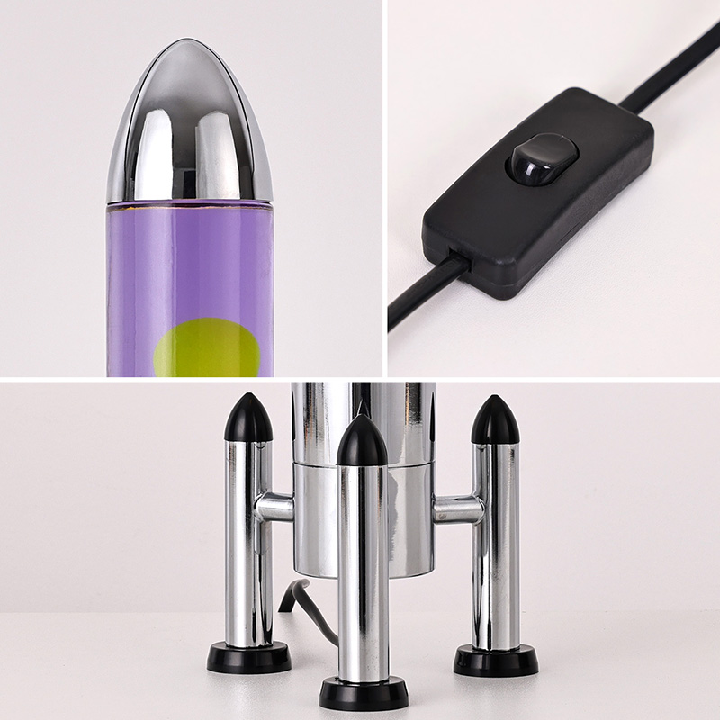 24VRoket gölgeli büyük LED Lava lambası, gümüş metal kabuğu ve şeffaf cam şişe gövdesiyle sade ama şık, klasik roket şekilli bir tasarıma sahiptir. İçerideki mor sıvının içinde sarı yüzüyor