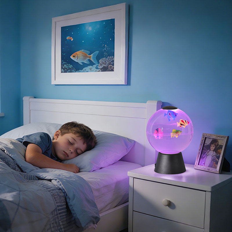 Her mekanda benzersiz bir vurgu oluşturan bu balık küresi, dinlendirici aydınlatma efektlerini eğlenceli animasyonlarla birleştiriyor