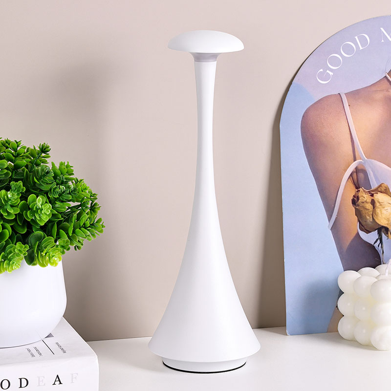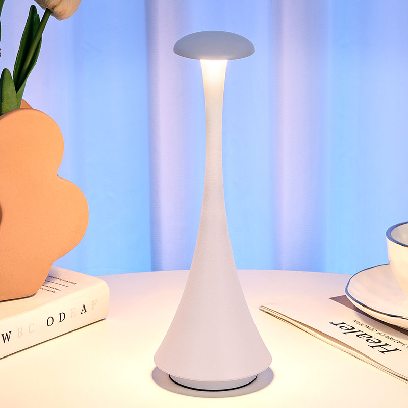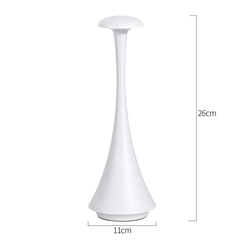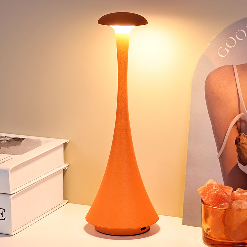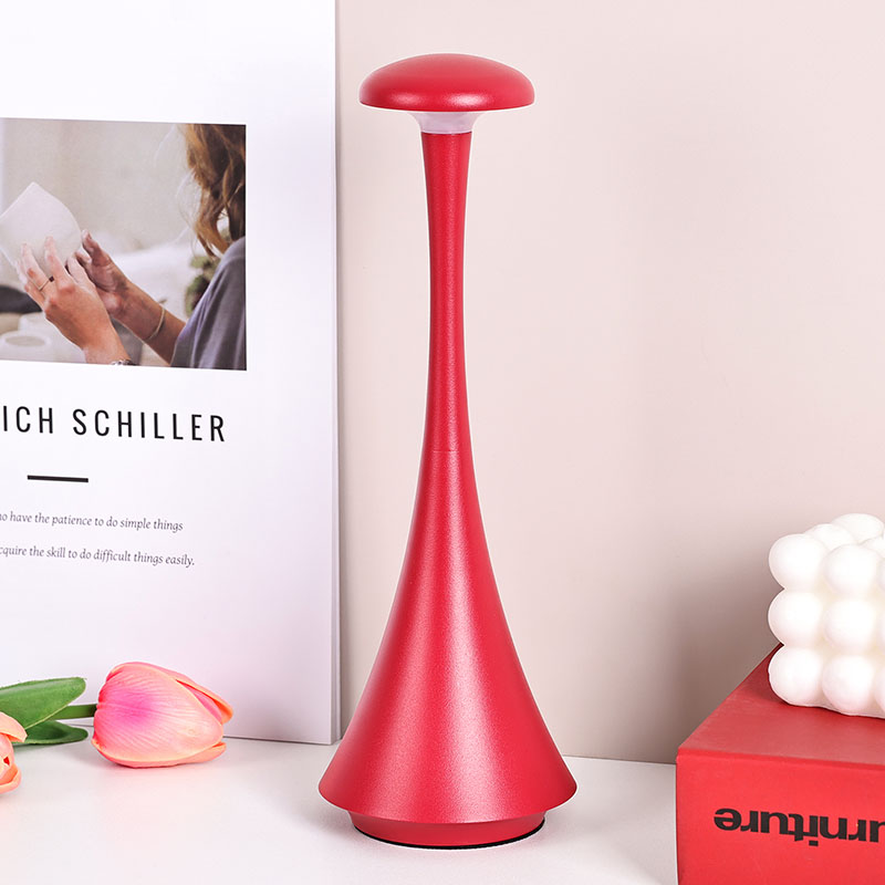Karartma anahtarına dokununYeni Tasarım Şarj Edilebilir Pilli LED Masa Lambası, sade ve düzgün hatları ve ergonomik şekli, mantar şekilli ve iğne kuyruklu tasarımı ve metal sıcak ışıklı LED masa lambası, yalnızca pratik bir aydınlatma aracı değil, aynı zamanda
