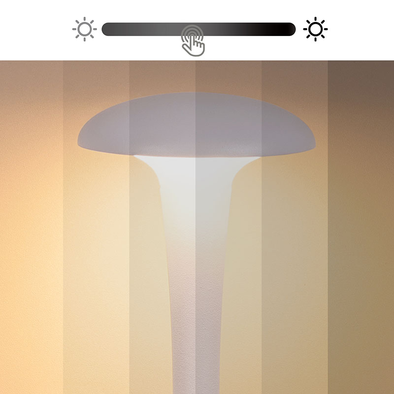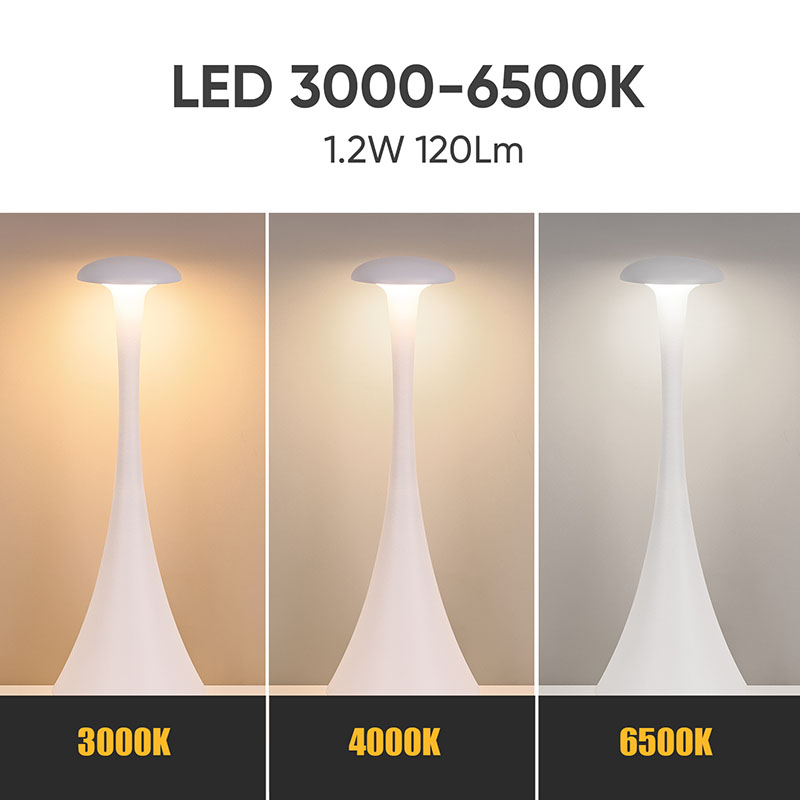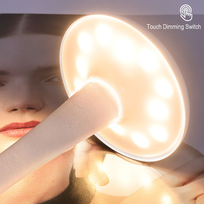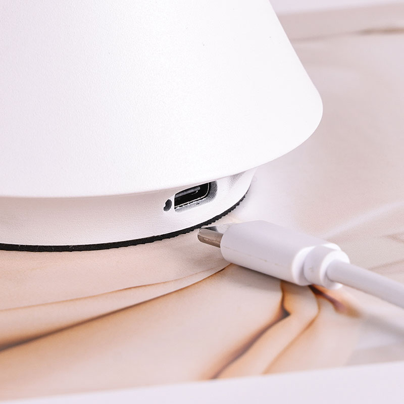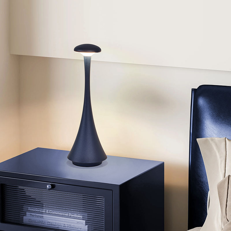 Karartma anahtarına dokununYeni Tasarım Şarj Edilebilir Pilli LED Masa Lambası, sade ve düzgün hatları ve ergonomik şekli, mantar şekilli ve iğne kuyruklu tasarımı ve metal sıcak ışıklı LED masa lambası, yalnızca pratik bir aydınlatma aracı değil, aynı zamanda