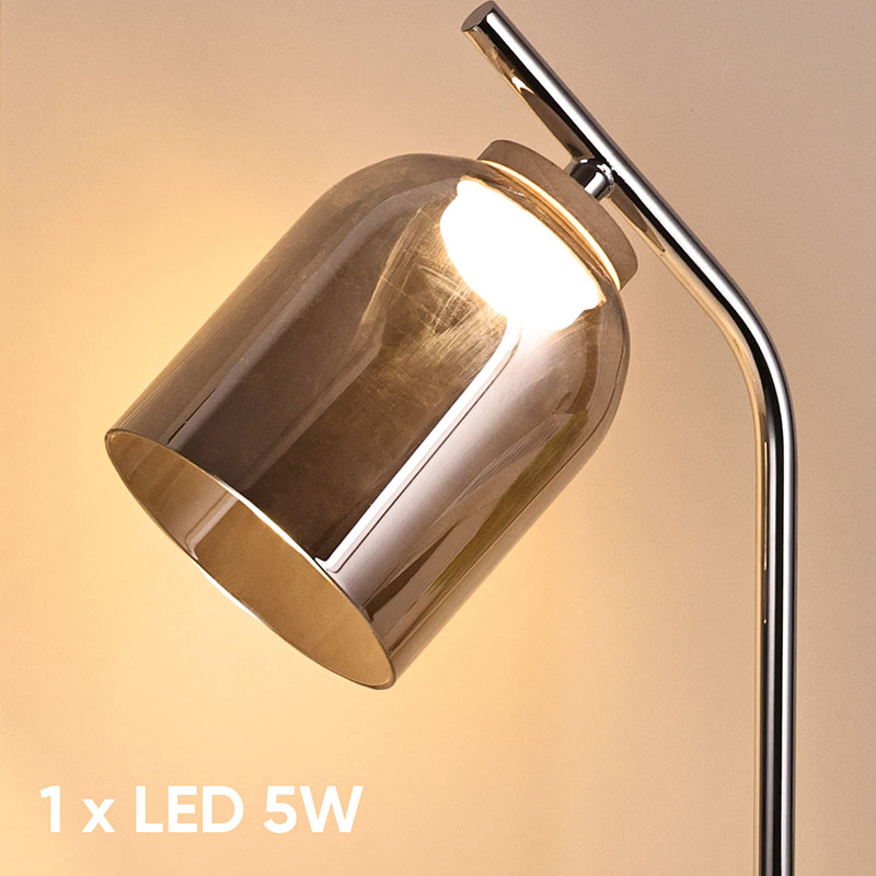 Krom taban, dumanlı (kehribar) cam abajurYenilikçi tasarım, cam malzeme, üst düzey ve zarif görünüm, son derece dekoratif masa lambası tasarım stili