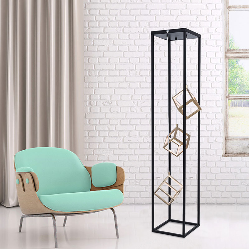 Modern tasarımlı lambaderler, ürünün en büyük özelliği metalden oluşan dikdörtgen çerçeve şekli ve içinde 3 adet kare LED avize bulunmaktadır. Genel tasarım, salonda dekorasyon olarak kullanılabilir ve üstte ışığın yoğunluğunu kontrol etmek için bir düğme vardır.