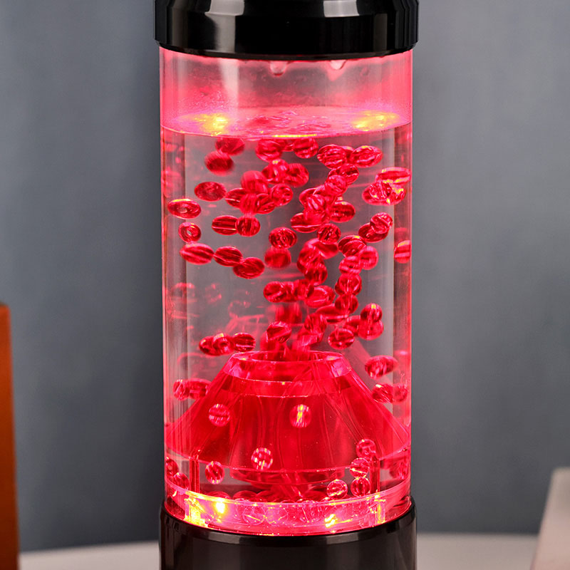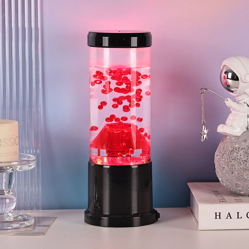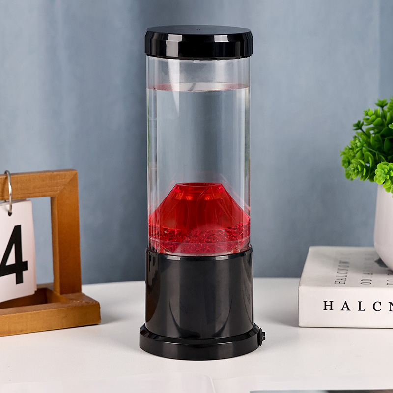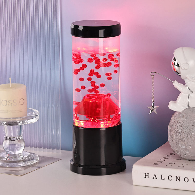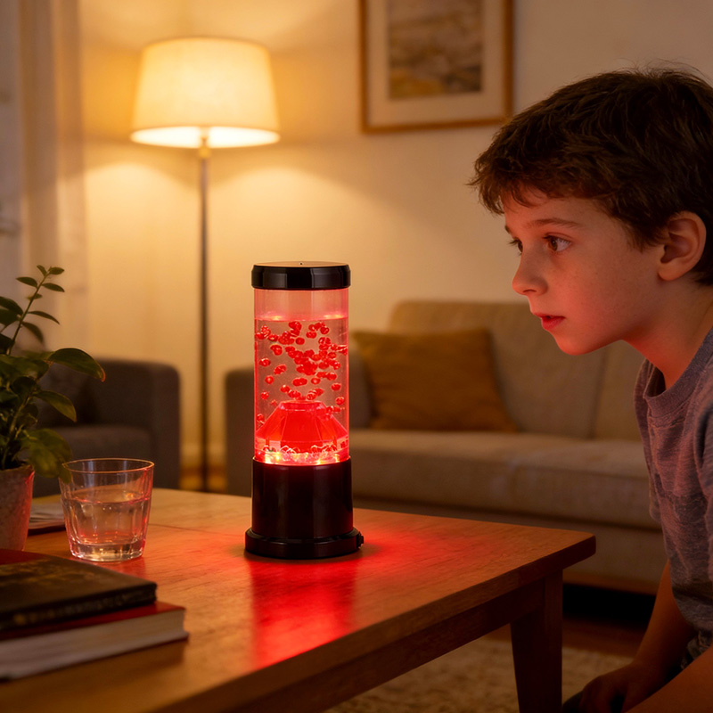 Gece lambasının merkezi parçası, volkanik bir krateri andıran şeffaf bir sütundur. Bu sütunun içinde, yer kabuğunun içinde akan erimiş lavları anımsatan, kırmızı kürelerin canlı bir görüntüsünü bulacaksınız. Bu küreler berrak bir sıvı içinde zarif bir şekilde yüzerek dinamik ve sürekli değişen bir görsel efekt yaratır. Işık parıldadıkça sıcak ve davetkar bir ışıltı yayar; her odada rahat bir atmosfer yaratmak için mükemmeldir.