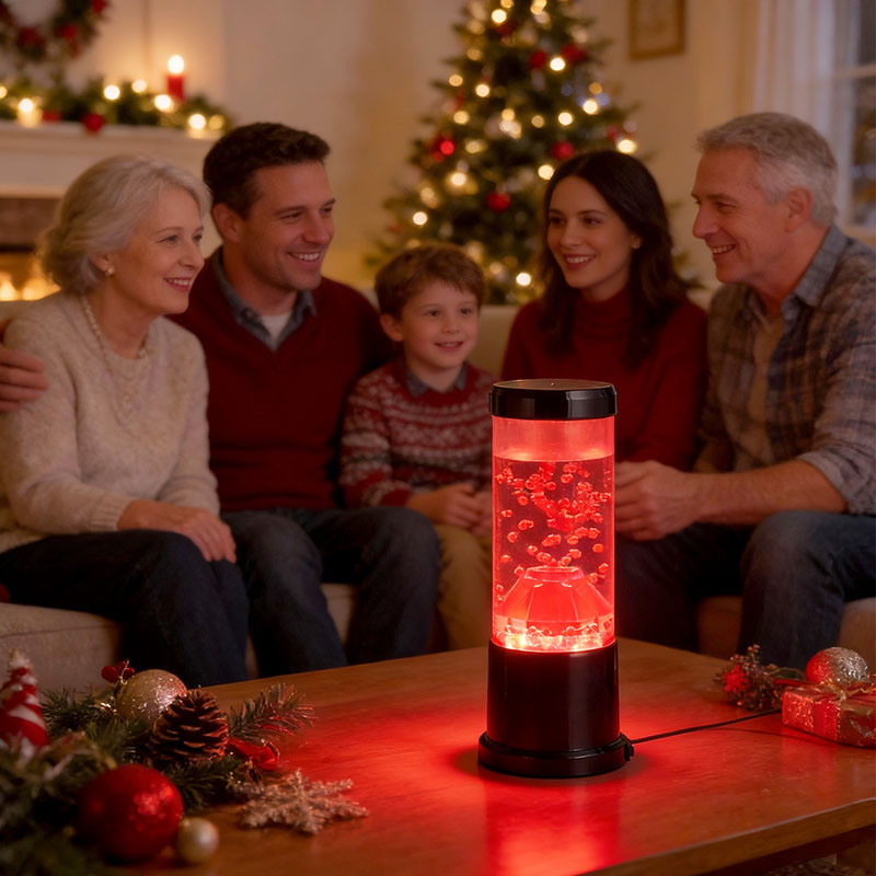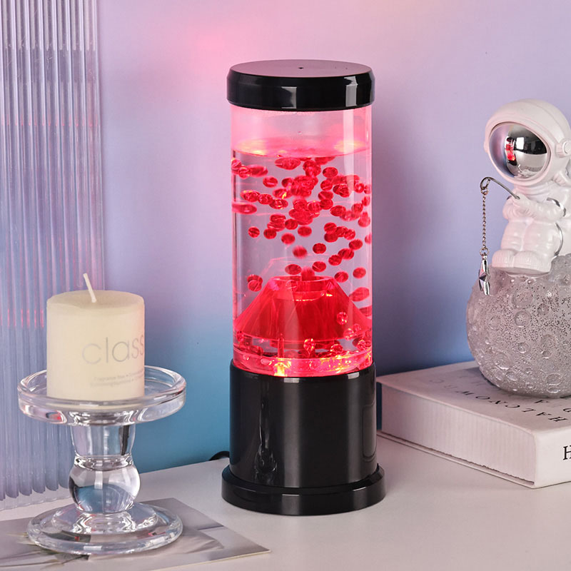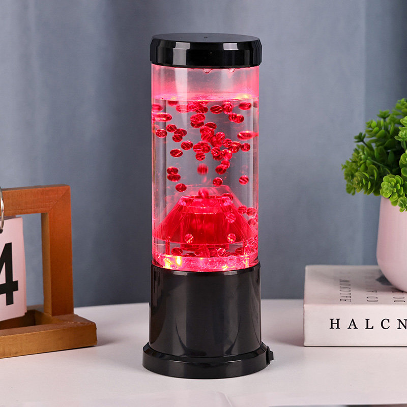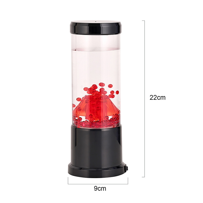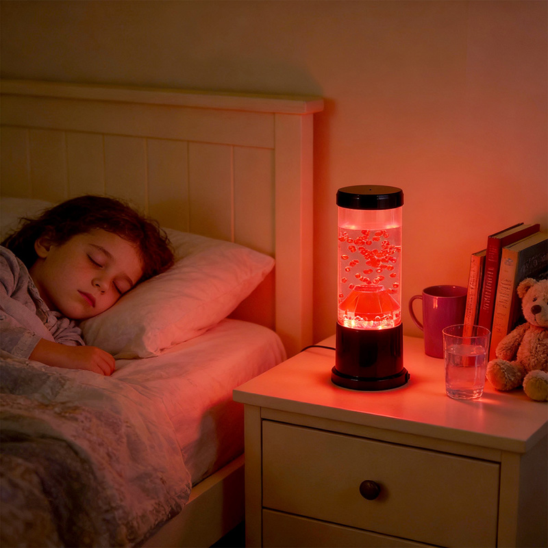 Gece lambasının merkezi parçası, volkanik bir krateri andıran şeffaf bir sütundur. Bu sütunun içinde, yer kabuğunun içinde akan erimiş lavları anımsatan, kırmızı kürelerin canlı bir görüntüsünü bulacaksınız. Bu küreler berrak bir sıvı içinde zarif bir şekilde yüzerek dinamik ve sürekli değişen bir görsel efekt yaratır. Işık parıldadıkça sıcak ve davetkar bir ışıltı yayar; her odada rahat bir atmosfer yaratmak için mükemmeldir.